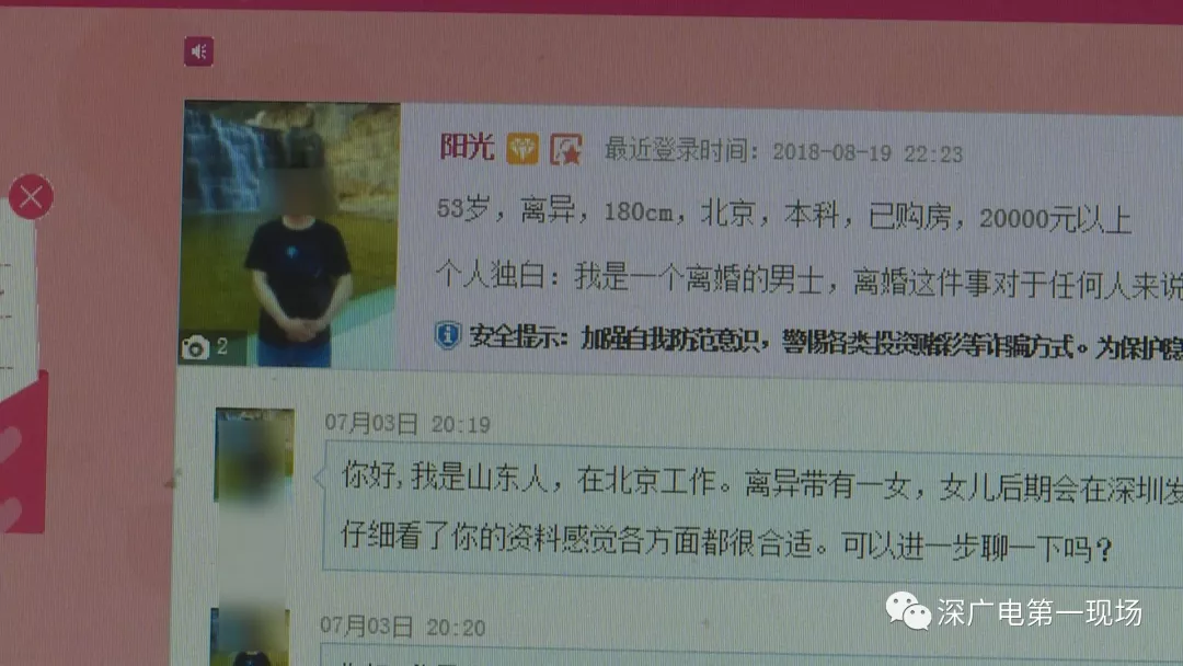 张女士说,她在三年前离了婚,如今儿子已经大学毕业,想着为自己的下半生找个依靠,于是张女士便在世纪佳缘网站花了三百多元注册了会员。7月初世纪佳缘网站上一个名叫“阳光”的北京网友联系了她。