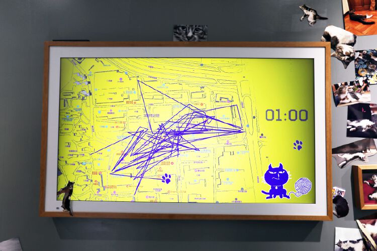 我看了一下,不得不说,它的作品比其他12位人类艺术家都高科技那么一丢丢,更让人敬佩的是它是“脚踏实地”地创作。作为一只云游在华侨城片区的萌宠,为安全起见,它的主(粉)人(丝)给它安装了一个小型GPS定位仪记录它一周的轨迹。时而出现在咖啡馆,时而出现在青年旅社,时而出现在写字楼……不羁的元宝凭借这幅用行为艺术创作的作品,足以跟来自日本和中国北京、上海、深圳的艺术家平起平坐。
