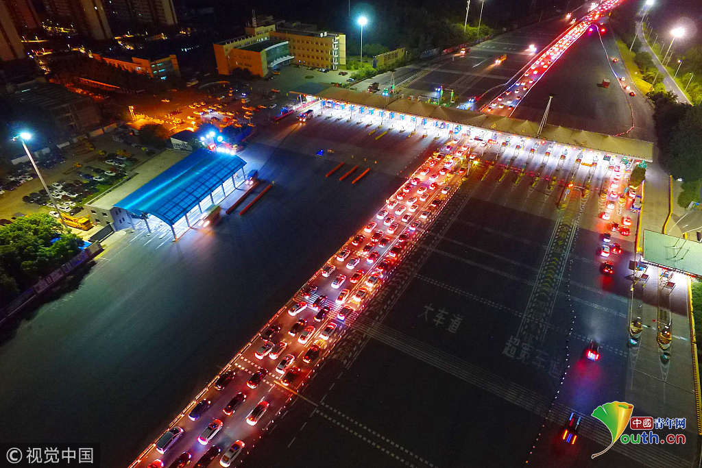 2018年10月1日,国庆假期首日凌晨1点左右,南京迎来出行高峰,所有高速公路出城方向迎来大批车辆,航拍南京长江二桥收费站,大量车辆排起长龙,场面尤为壮观。图片作者:方东旭