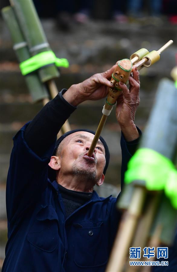 乌英苗寨村民在新芦笙柱下吹芦笙(12月22日摄)。新华社记者黄孝邦摄