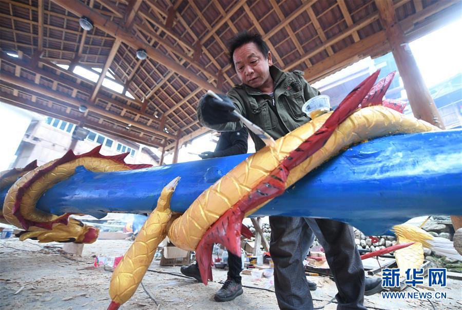 乌英苗寨村民给新芦笙柱涂油漆(12月20日摄)。新华社记者黄孝邦摄