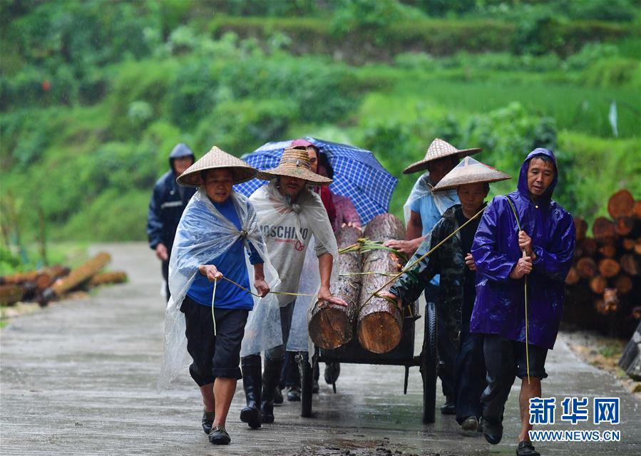 在乌英苗寨,村民在雨中搬运木头,准备修建新房(7月6日摄)。新华社记者黄孝邦摄
