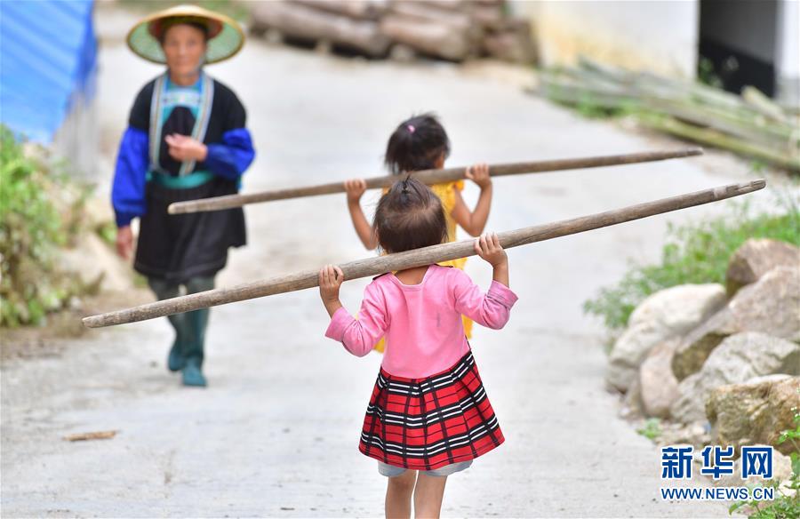 乌英苗寨的两名小朋友帮大人拿扁担回家(9月2日摄)。新华社记者黄孝邦摄