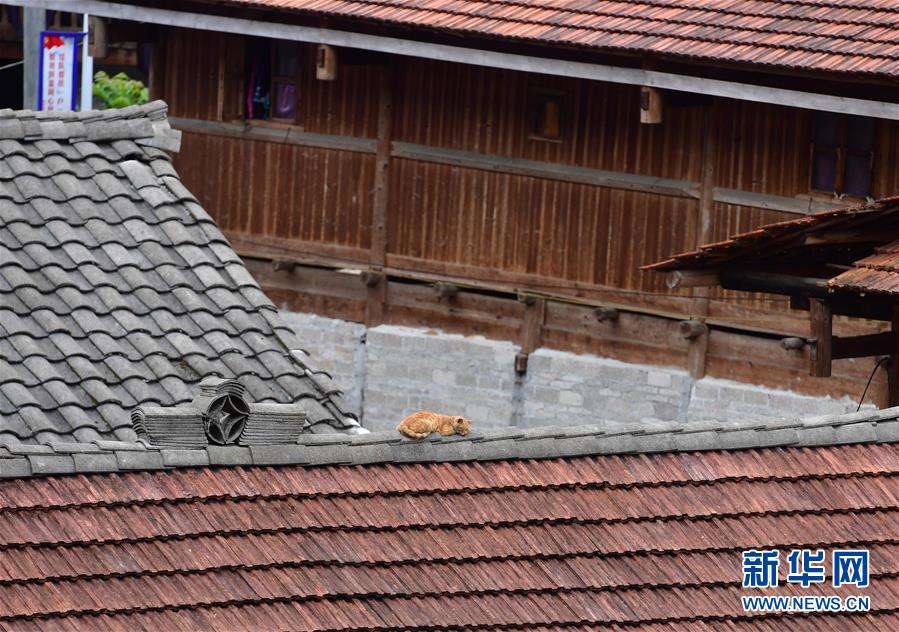 乌英苗寨的一只猫在屋顶睡觉(9月2日摄)。新华社记者黄孝邦摄