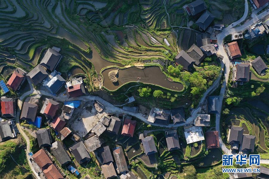 这是融水苗族自治县杆洞乡小河村高羽苗寨的木楼和梯田(3月31日摄,无人机照片)。新华社记者黄孝邦摄