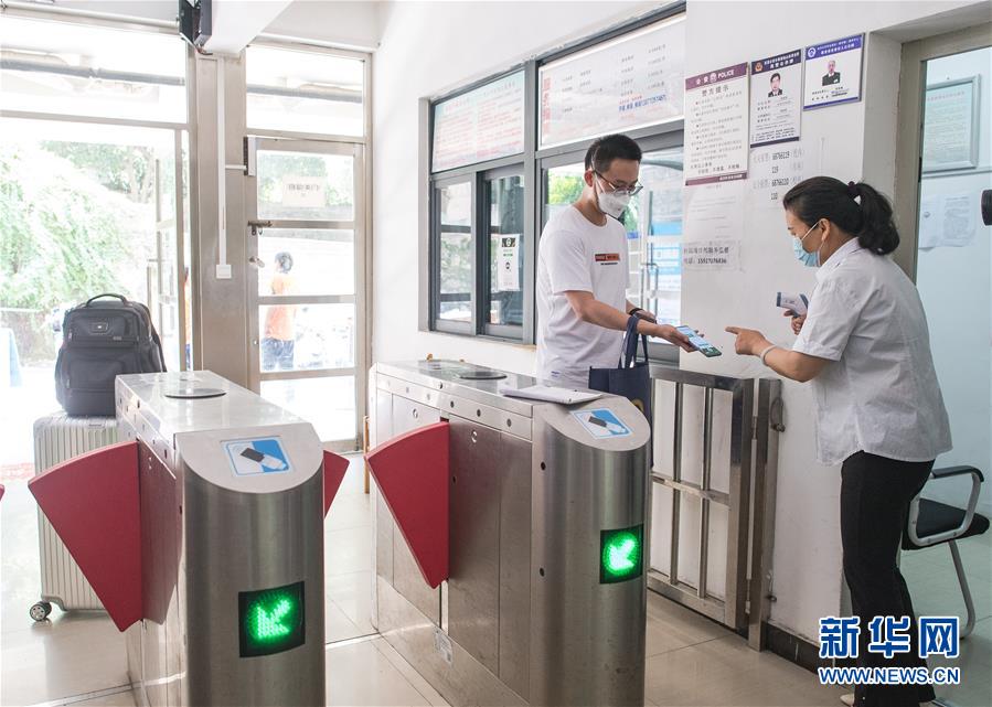6月8日,在武汉大学,返校学生扫健康码以及测体温后进入宿舍。6月8日起,武汉大学、华中科技大学、武汉理工大学、华中师范大学等多所武汉高校迎来首批返校毕业生。新华社记者肖艺九摄