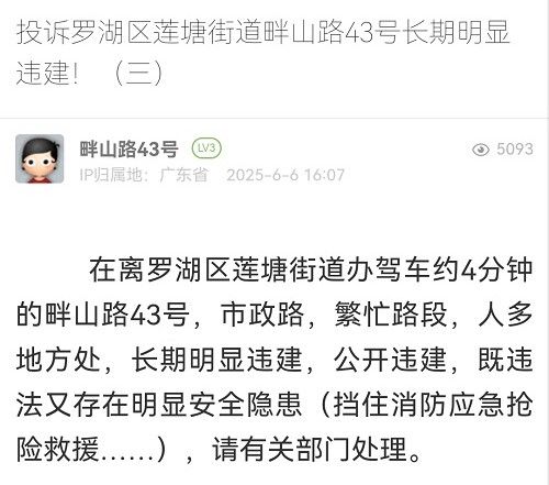 20. 帖文《投诉罗湖区莲塘街道畔山路43号长期明显违建!(三)》