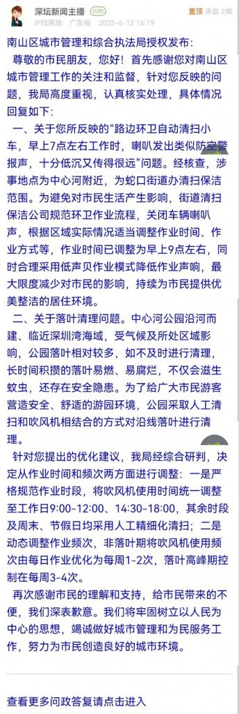 针对您提出的优化建议,我局经综合研判,决定从作业时间和频次两方面进行调整:一是严格规范作业时段,将吹风机使用时间统一调整至工作日9:00-12:00、14:30-18:00,其余时段及周末、节假日均采用人工精细化清扫;二是动态调整作业频次,非落叶期将吹风机使用频次由每日作业优化为每周1-2次,落叶高峰期控制在每周3-4次。