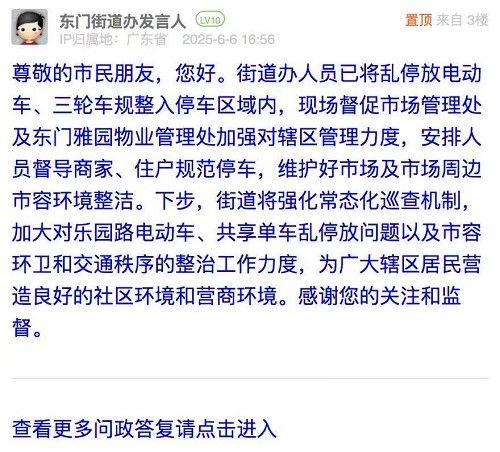 尊敬的市民朋友,您好。街道办人员已将乱停放电动车、三轮车规整入停车区域内,现场督促市场管理处及东门雅园物业管理处加强对辖区管理力度,安排人员督导商家、住户规范停车,维护好市场及市场周边市容环境整洁。下步,街道将强化常态化巡查机制,加大对乐园路电动车、共享单车乱停放问题以及市容环卫和交通秩序的整治工作力度,为广大辖区居民营造良好的社区环境和营商环境。感谢您的关注和监督。