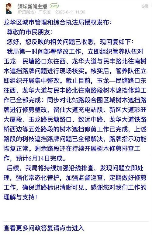 我局第一时间部署整改工作,立即组织管养队伍对玉龙—民塘路口东往西、龙华大道与民丰路北往南树木遮挡路牌问题进行现场核实。核实后,管养队伍立即组织开展集中整改。截止目前,玉龙—民塘路口东往西、龙华大道与民丰路北往南路段树木遮挡修剪工作已全部完成;同步对北站路段合围区域树木遮挡路牌进行修剪整改,留仙大道充电站段、新区大道彩旺大厦段、玉龙路民塘路口、致远中路、龙华大道铁路桥西边等五处路段的树木遮挡修剪工作已完成,上述路段的树枝遮挡路牌问题已全部解决,路牌指示功能恢复正常。剩余路段还在持续开展树木修剪排查工作,预计6月14日完成。