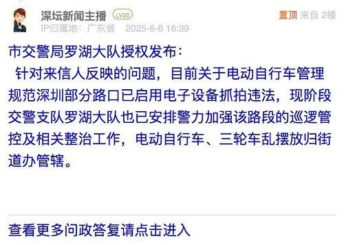 针对来信人反映的问题,目前关于电动自行车管理规范深圳部分路口已启用电子设备抓拍违法,现阶段交警支队罗湖大队也已安排警力加强该路段的巡逻管控及相关整治工作,电动自行车、三轮车乱摆放归街道办管辖。