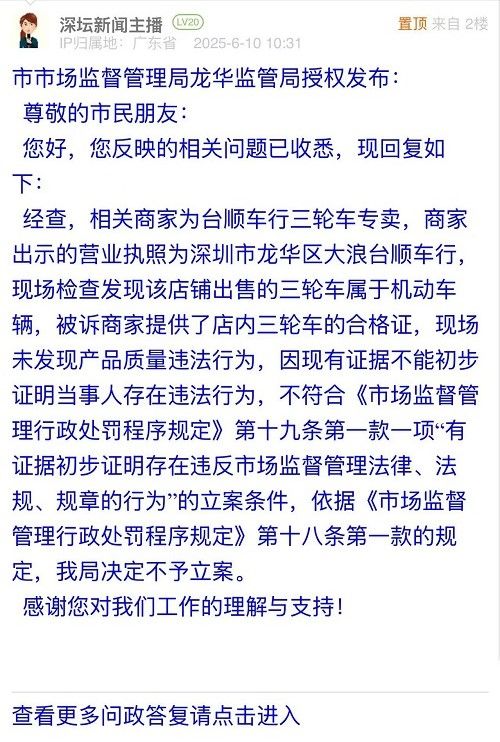 经查,相关商家为台顺车行三轮车专卖,商家出示的营业执照为深圳市龙华区大浪台顺车行,现场检查发现该店铺出售的三轮车属于机动车辆,被诉商家提供了店内三轮车的合格证,现场未发现产品质量违法行为,因现有证据不能初步证明当事人存在违法行为,不符合《市场监督管理行政处罚程序规定》第十九条第一款一项“有证据初步证明存在违反市场监督管理法律、法规、规章的行为”的立案条件,依据《市场监督管理行政处罚程序规定》第十八条第一款的规定,我局决定不予立案。