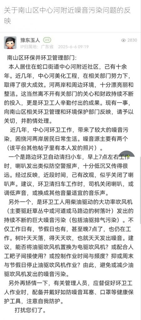 19. 帖文《关于南山区中心河附近噪音污染问题的反映》