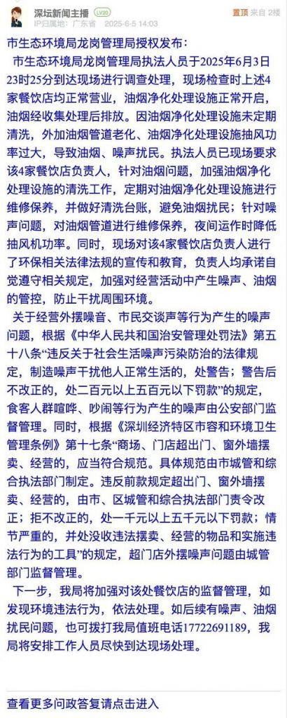 市生态环境局龙岗管理局执法人员于2025年6月3日23时25分到达现场进行调查处理,现场检查时上述4家餐饮店均正常营业,油烟净化处理设施正常开启,油烟经收集处理后排放。因油烟净化处理设施未定期清洗,外加油烟管道老化、油烟净化处理设施抽风功率过大,导致油烟、噪声扰民。执法人员已现场要求该4家餐饮店负责人,针对油烟问题,加强油烟净化处理设施的清洗工作,定期对油烟净化处理设施进行维修保养,并做好清洗台账,避免油烟扰民;针对噪声问题,对油烟管道进行维修保养,夜间运作时降低抽风机功率。同时,现场对该4家餐饮店负责人进行了环保相关法律法规的宣传和教育,负责人均承诺自觉遵守相关规定,加强对经营活动中产生噪声、油烟的管控,防止干扰周围环境。