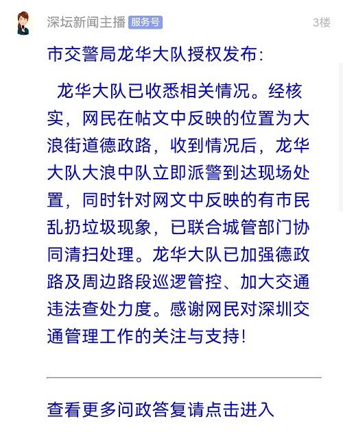龙华大队已收悉相关情况。经核实,网民在帖文中反映的位置为大浪街道德政路,收到情况后,龙华大队大浪中队立即派警到达现场处置,同时针对网文中反映的有市民乱扔垃圾现象,已联合城管部门协同清扫处理。龙华大队已加强德政路及周边路段巡逻管控、加大交通违法查处力度。感谢网民对深圳交通管理工作的关注与支持!