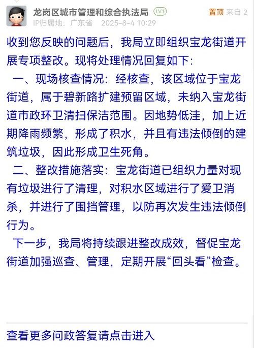 收到您反映的问题后,我局立即组织宝龙街道开展专项整改。现将处理情况回复如下: