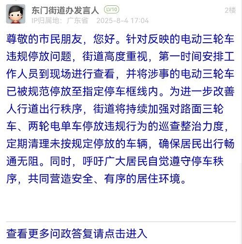 感谢您对我办工作的理解与支持,我们将以为民服务为宗旨,进一步规范辖区电动自行车秩序,努力为市民创造更好的城市环境。