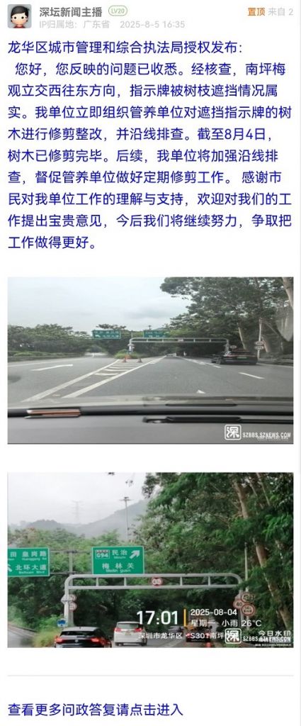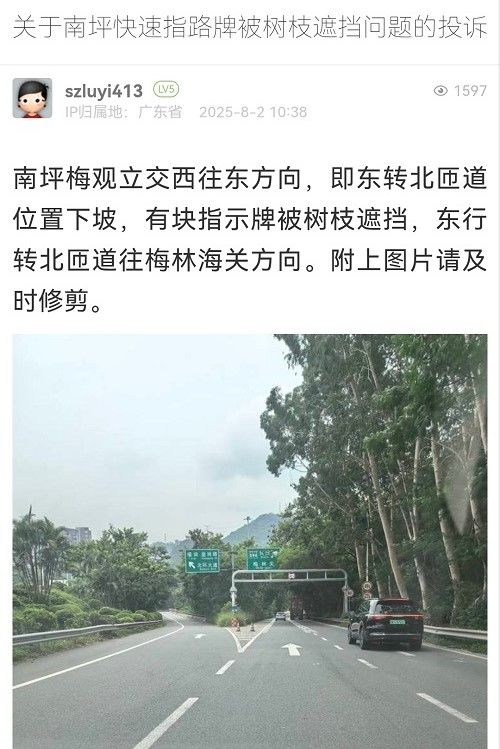 33. 帖文《关于南坪快速指路牌被树枝遮挡问题的投诉》