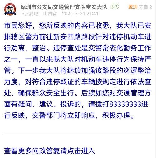 深圳市公安局交通管理局龙华大队已收悉相关情况,非常感谢市民的反馈。接到该反馈后,大队立即前往现场查看情况。