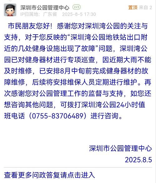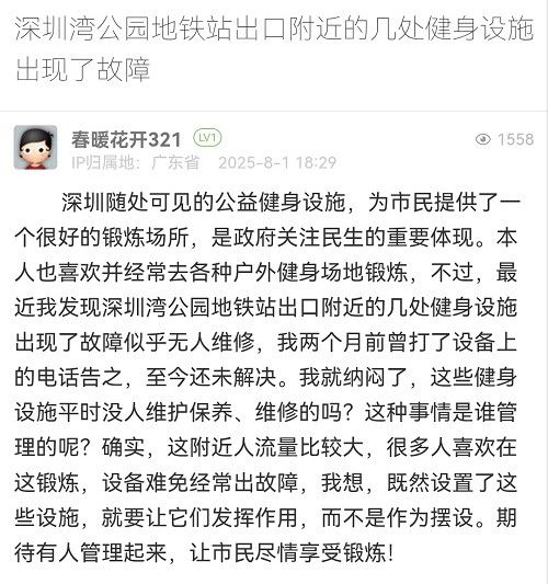 34. 帖文《深圳湾公园地铁站出口附近的几处健身设施出现了故障》