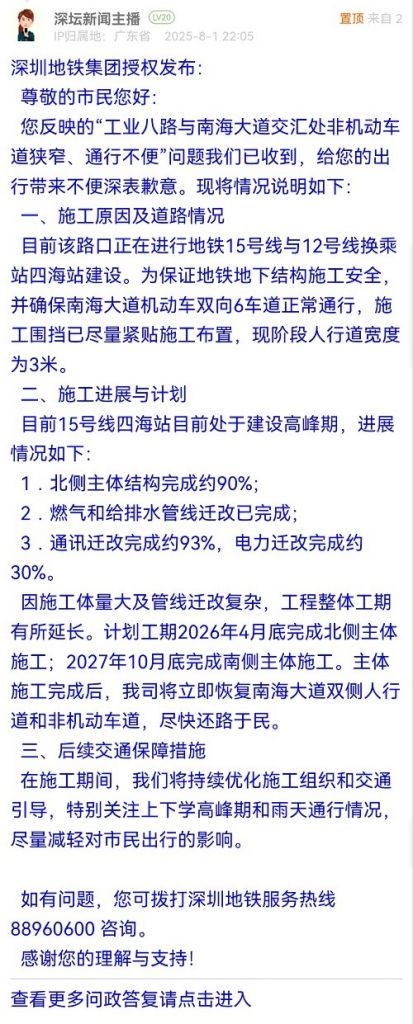 因施工体量大及管线迁改复杂,工程整体工期有所延长。计划工期2026年4月底完成北侧主体施工;2027年10月底完成南侧主体施工。主体施工完成后,我司将立即恢复南海大道双侧人行道和非机动车道,尽快还路于民。