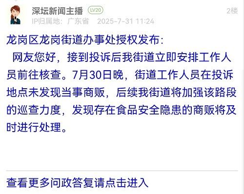 网友您好,接到投诉后我街道立即安排工作人员前往核查。7月30日晚,街道工作人员在投诉地点未发现当事商贩,后续我街道将加强该路段的巡查力度,发现存在食品安全隐患的商贩将及时进行处理。