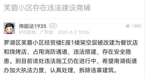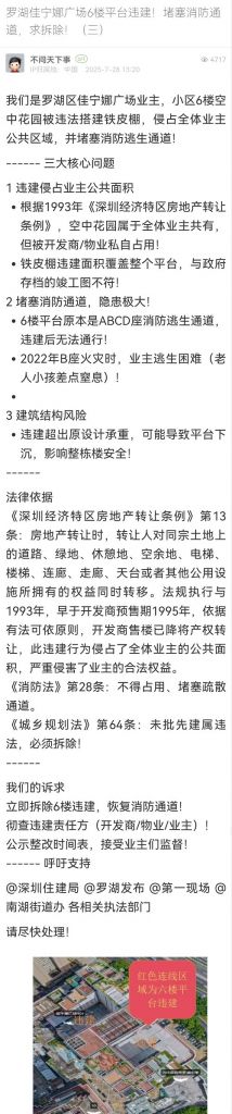 1. 帖文《罗湖佳宁娜广场6楼平台违建!堵塞消防通道,求拆除!(三)》