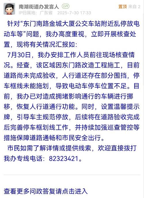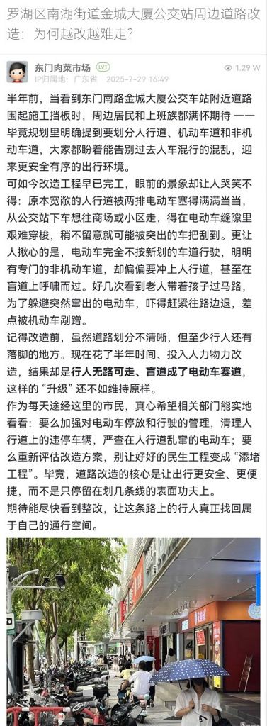 7. 帖文《罗湖区南湖街道金城大厦公交站周边道路改造:为何越改越难走?》