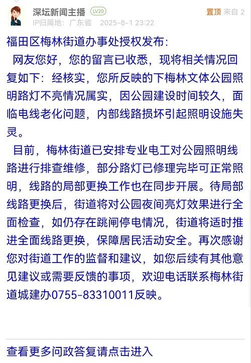 网友您好,您的留言已收悉,现将相关情况回复如下:经核实,您所反映的下梅林文体公园照明路灯不亮情况属实,因公园建设时间较久,面临电线老化问题,内部线路损坏引起照明设施失灵。
