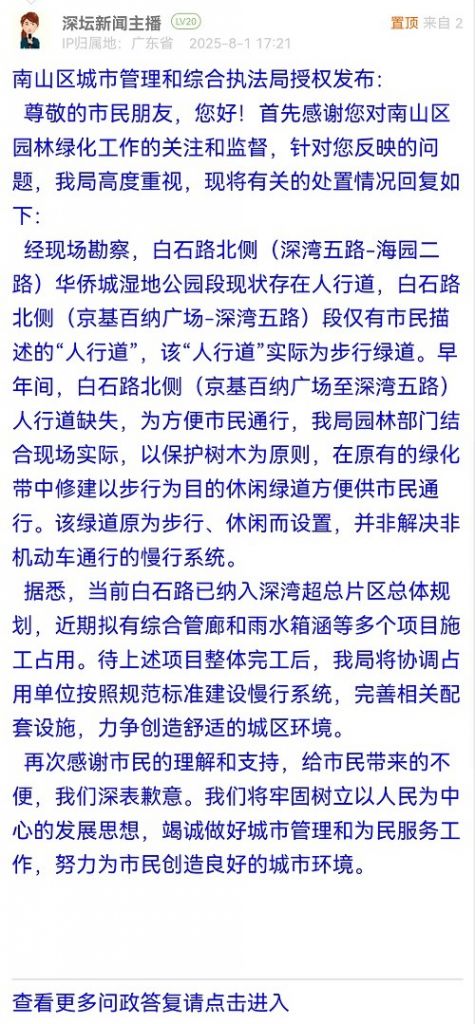 据悉,当前白石路已纳入深湾超总片区总体规划,近期拟有综合管廊和雨水箱涵等多个项目施工占用。待上述项目整体完工后,我局将协调占用单位按照规范标准建设慢行系统,完善相关配套设施,力争创造舒适的城区环境。