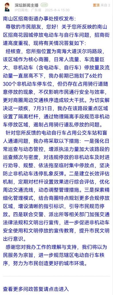 25. 帖文《南山区招商花园城停放电动车与自行车问题》