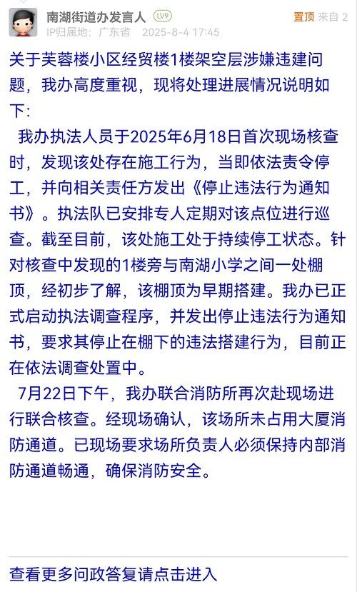 我办执法人员于2025年6月18日首次现场核查时,发现该处存在施工行为,当即依法责令停工,并向相关责任方发出《停止违法行为通知书》。执法队已安排专人定期对该点位进行巡查。截至目前,该处施工处于持续停工状态。针对核查中发现的1楼旁与南湖小学之间一处棚顶,经初步了解,该棚顶为早期搭建。我办已正式启动执法调查程序,并发出停止违法行为通知书,要求其停止在棚下的违法搭建行为,目前正在依法调查处置中。