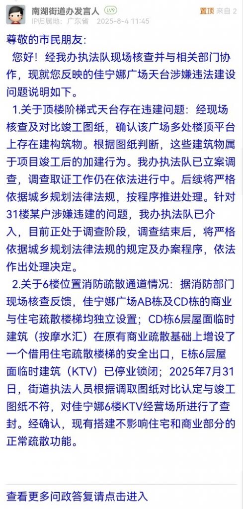 2.关于6楼位置消防疏散通道情况:据消防部门现场核查反馈,佳宁娜广场AB栋及CD栋的商业与住宅疏散楼梯均独立设置;CD栋6层屋面临时建筑(按摩水汇)在原有商业疏散基础上增设了一个借用住宅疏散楼梯的安全出口,E栋6层屋面临时建筑(KTV)已停业锁闭;2025年7月31日,街道执法人员根据调取图纸对比认定与竣工图纸不符,对佳宁娜6楼KTV经营场所进行了查封。经确认,现有搭建不影响住宅和商业部分的正常疏散功能。