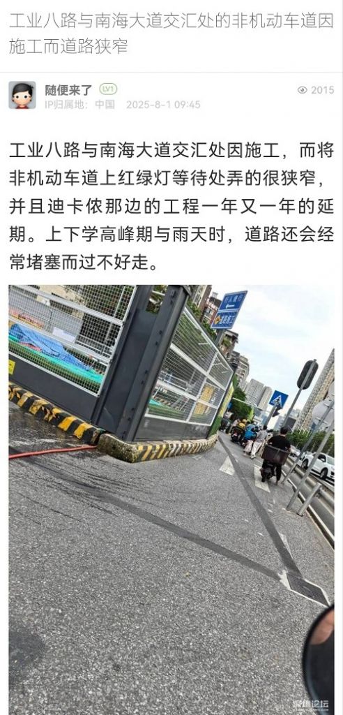 22. 帖文《工业八路与南海大道交汇处的非机动车道因施工而道路狭窄》