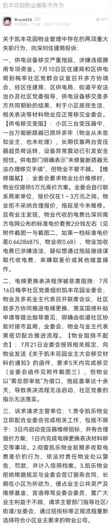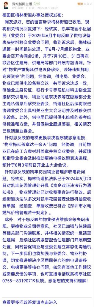 网友您好,您的留言诉求梅林街道已收悉,现将相关情况回复如下:经核实,凯丰花园小区居民(业委会)于2025年6月中旬反映了供电设备表决材料移交业委会问题,收到诉求后,梅林街道第一时间跟进处理,于6月-7月组织物业、业委会召开协调会2场,并于7月10日、31日再次联合区住建局、供电局等部门开展专题协调。针对“物业严重拖延供电设备移交,涉嫌违规挪用专项资金”的问题,经协调,供电局、业委会、物业已就供电设备移交这一共同诉求达成一致,明确业主身份证、银行卡号等隐私材料由物业直接移交供电局,物业同意表决表等在隐藏部分业主隐私信息后移交业委会,街道社区后续将跟进协调业委会出具相关业主大会证明并及时移交供电设备。此外,供电局已提供供电维修的参考维修标准和方案,并督促物业跟进落实,相关情况已反馈至业委会。