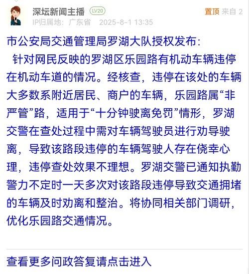 针对网民反映的罗湖区乐园路有机动车辆违停在机动车道的情况。经核查,违停在该处的车辆大多数系附近居民、商户的车辆,乐园路属“非严管”路,适用于“十分钟驶离免罚”情形,罗湖交警在查处过程中需对车辆驾驶员进行劝导驶离,导致该路段违停的车辆驾驶人存在侥幸心理,违停查处效果不理想。罗湖交警已通知执勤警力不定时一天多次对该路段违停导致交通拥堵的车辆及时劝离和整治。将协同相关部门调研,优化乐园路交通情况。