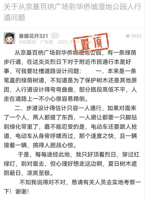 20. 帖文《关于从京基百纳广场到华侨城湿地公园人行道问题》