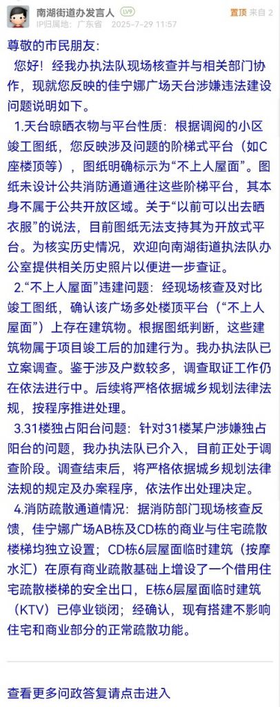 1.关于顶楼阶梯式天台存在违建问题:经现场核查及对比竣工图纸,确认该广场多处楼顶平台上存在建构筑物。根据图纸判断,这些建筑物属于项目竣工后的加建行为。我办执法队已立案调查,调查取证工作仍在依法进行中。后续将严格依据城乡规划法律法规,按程序推进处理。针对31楼某户涉嫌违建的问题,我办执法队已介入,目前正处于调查阶段,调查结束后,将严格依据城乡规划法律法规的规定及办案程序,依法作出处理决定。