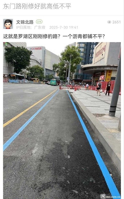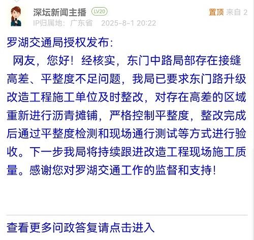 网友,您好!经核实,东门中路局部存在接缝高差、平整度不足问题,我局已要求东门路升级改造工程施工单位及时整改,对存在高差的区域重新进行沥青摊铺,严格控制平整度,整改完成后通过平整度检测和现场通行测试等方式进行验收。下一步我局将持续跟进改造工程现场施工质量。感谢您对罗湖交通工作的监督和支持!