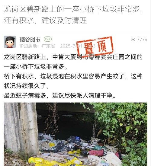 19. 帖文《龙岗区碧新路上的一座小桥下垃圾非常多,还有积水,建议及时清理》