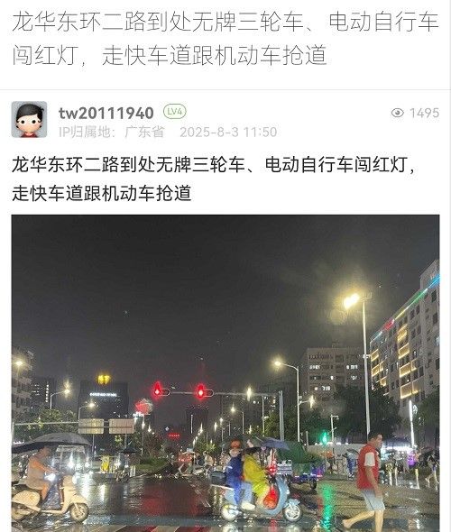 31. 帖文《龙华东环二路到处无牌三轮车、电动自行车闯红灯,走快车道跟机动车抢道》