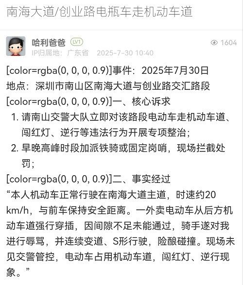 11. 帖文《南海大道/创业路电瓶车走机动车道》