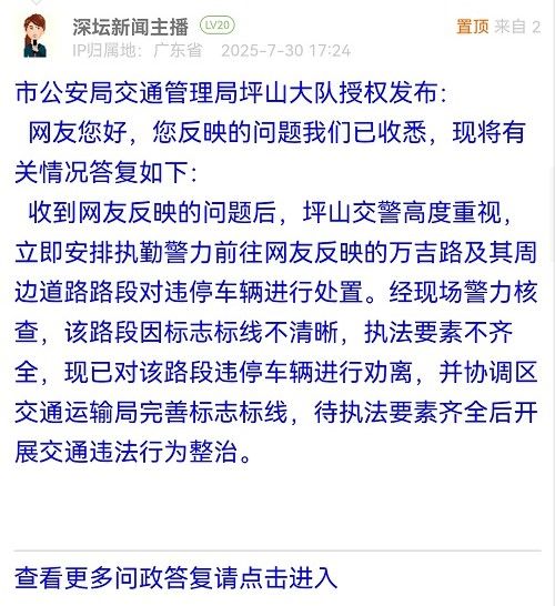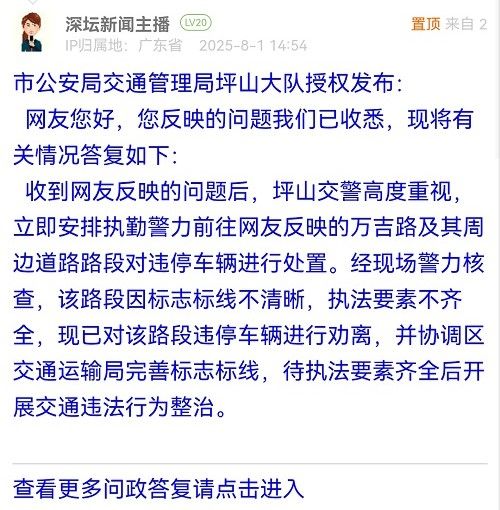 收到网友反映的问题后,坪山交警高度重视,立即安排执勤警力前往网友反映的万吉路及其周边道路路段对违停车辆进行处置。经现场警力核查,该路段因标志标线不清晰,执法要素不齐全,现已对该路段违停车辆进行劝离,并协调区交通运输局完善标志标线,待执法要素齐全后开展交通违法行为整治。