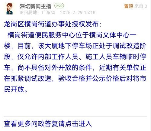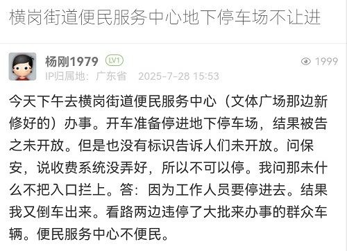 2. 帖文《横岗街道便民服务中心地下停车场不让进》