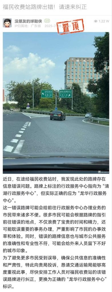 3. 帖文《福民收费站路牌出错!请速来纠正》