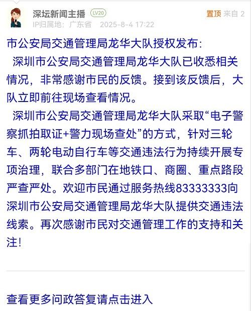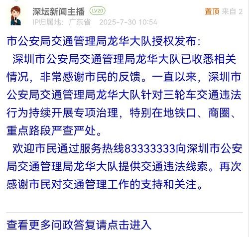 深圳市公安局交通管理局龙华大队已收悉相关情况,非常感谢市民的反馈。一直以来,深圳市公安局交通管理局龙华大队针对三轮车交通违法行为持续开展专项治理,特别在地铁口、商圈、重点路段严查严处。