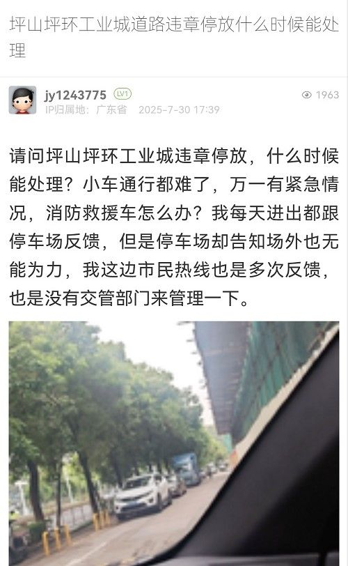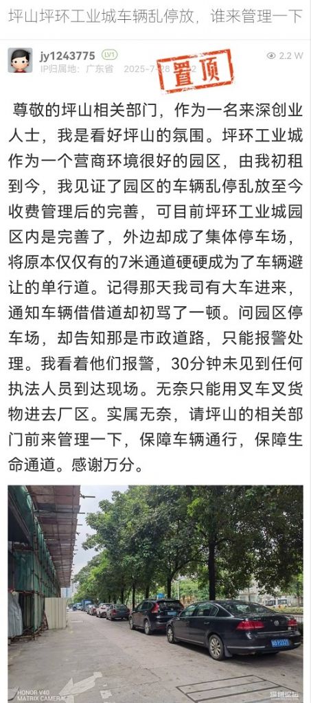4. 帖文《坪山坪环工业城车辆乱停放,谁来管理一下》