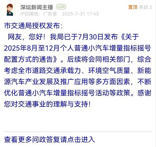 网友,您好!我局已于7月30日发布《关于2025年8月至12月个人普通小汽车增量指标摇号配置方式的通告》。后续将会同相关部门,综合考虑全市道路交通承载力、环境空气质量、新能源汽车产业发展及推广应用等多方面因素,不断优化普通小汽车增量指标摇号活动等政策。感谢您对交通事业的理解与支持!