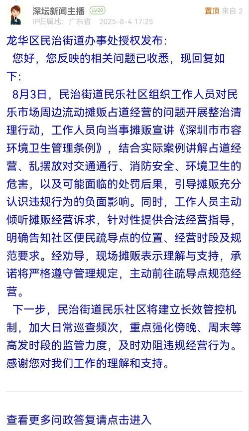 下一步,民治街道民乐社区将建立长效管控机制,加大日常巡查频次,重点强化傍晚、周末等高发时段的监管力度,及时劝阻违规经营行为。感谢您对我们工作的理解和支持。