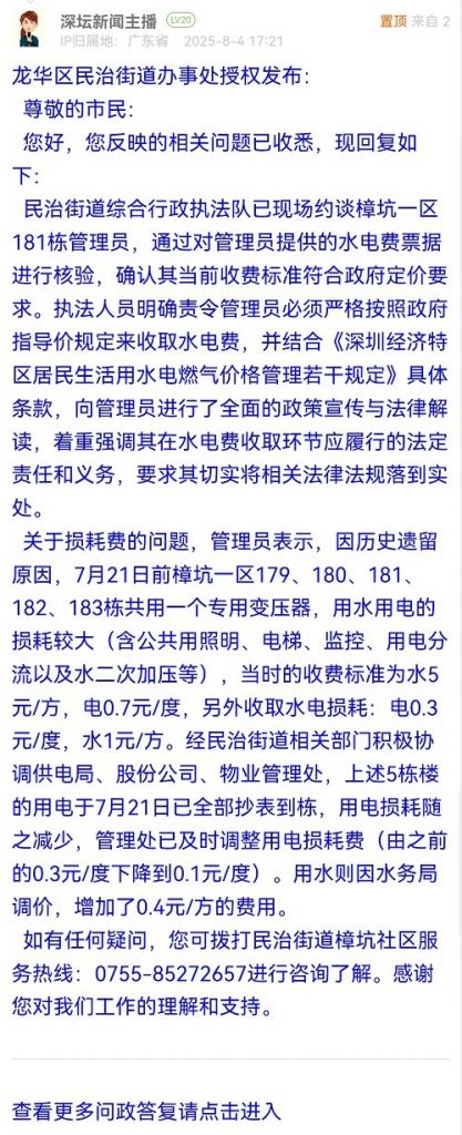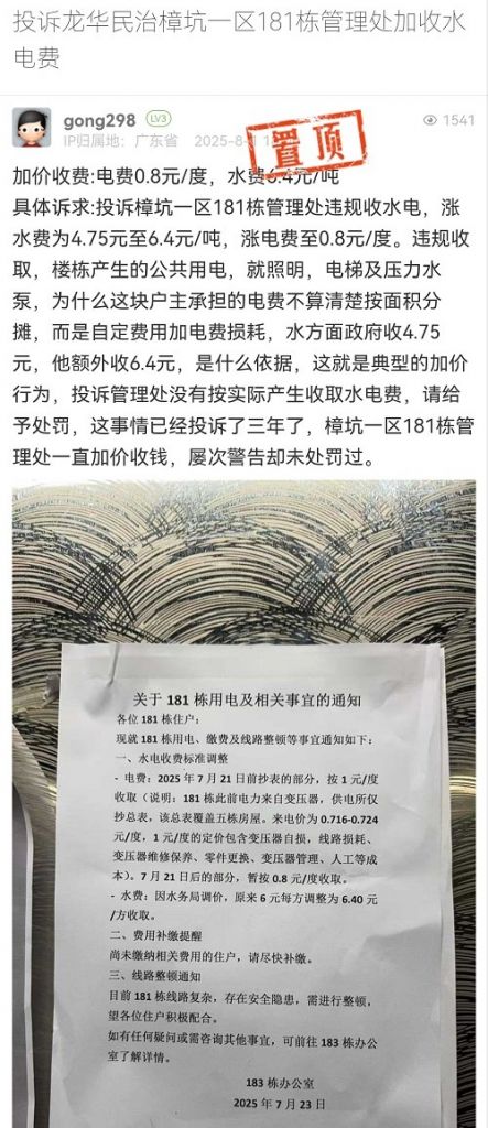 24. 帖文《投诉龙华民治樟坑一区181栋管理处加收水电费》